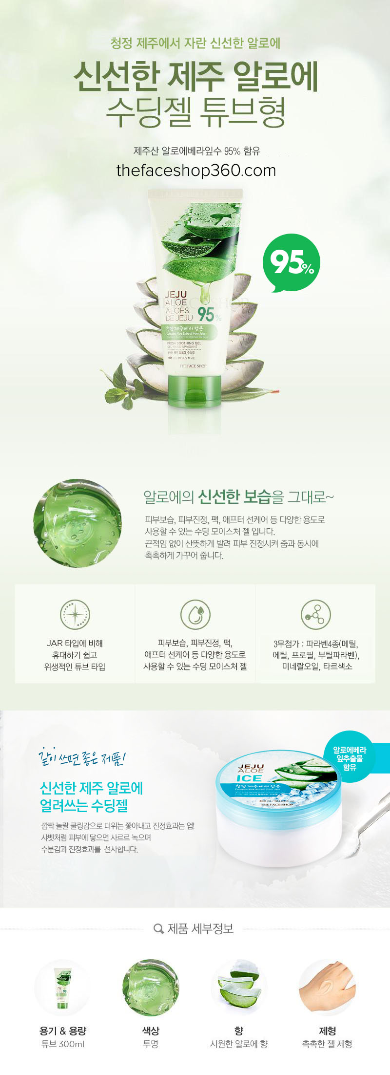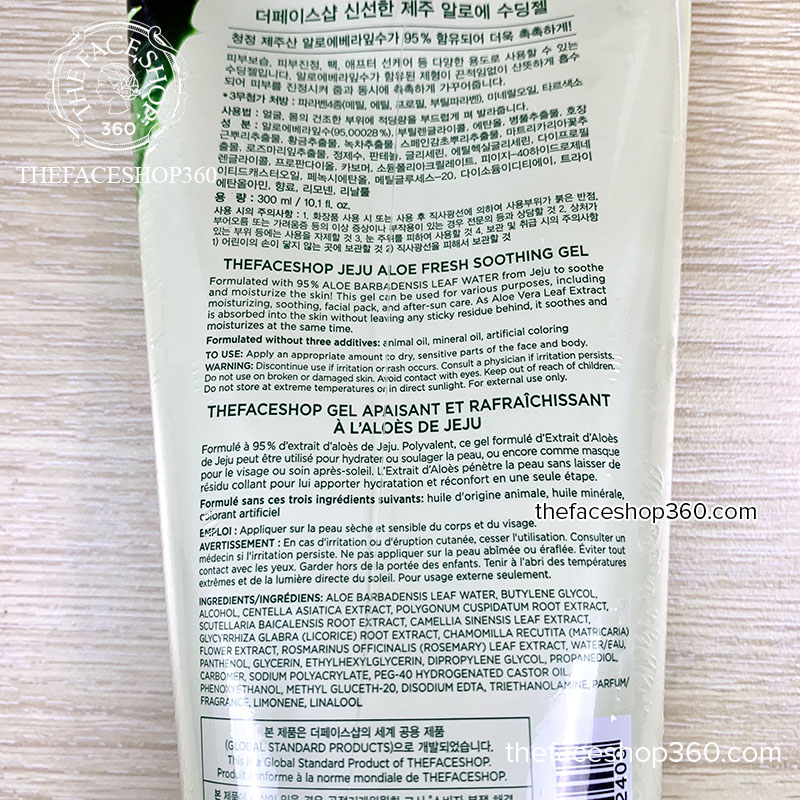 Gel 95% từ lô hội. Với kết cấu gel dịu mát sẽ giúp bạn cảm nhận ngay sự thư giãn trên da tức thì. Cùng với khả năng thẩm thấu nhanh và không gây cảm giác nhờn rít. Sản phẩm giúp phục hồi độ ẩm trên da và có thể sử dụng làm mặt nạ dưỡng ẩm. Sản phẩm dưỡng phục hồi da sau khi đi nắng.
