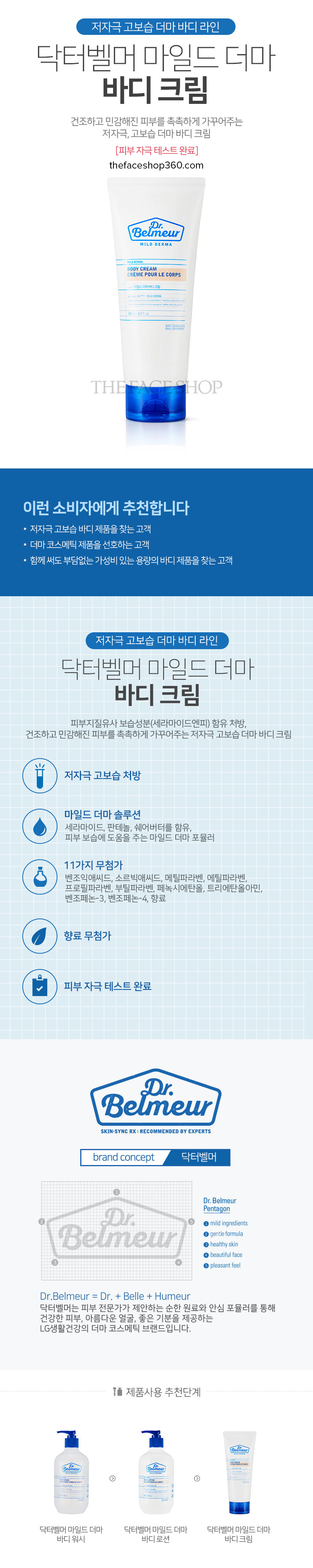 Dr. Belmeur Mild Derma Care Body line là dòng sản phẩm hạn chế kích ứng & dưỡng ẩm tối ưu cho làn da body. Đặc biệt thích hợp cho làn da khô, nhạy cảm. Sản phẩm chứa 100% thành phần đạt chứng nhận tiêu chuẩn xanh EWG. (Thân thiện và ít có khả năng gây kích ứng cũng như các nguy cơ gây hại khác tới sức khỏe người dùng). Ứng dụng công nghệ Skin-sync RxTM tân tiến của tập đoàn LG.