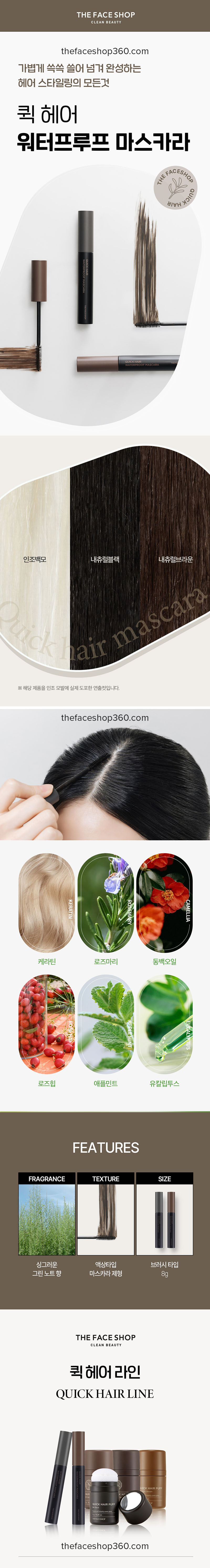 Quick Hair Waterproof Mascara của The Face Shop là mascara dành cho tóc, có khả năng chống thấm nước, giúp che phủ tóc bạc nhanh chóng và dễ dàng, đồng thời còn có thể dùng để tạo kiểu tóc, cố định tóc con và làm phồng chân tóc.