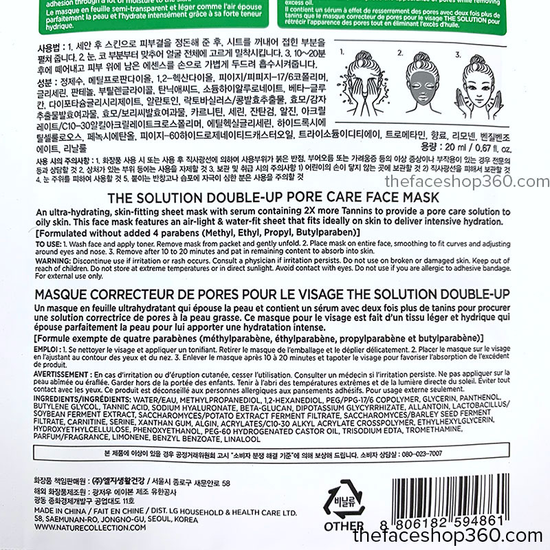 Mặt nạ giấy The Solution Double Up Pore Care Face Mask sẽ giúp làm se khít lỗ chân lông, săn mịn da và chống oxy hóa cho làn da. Mẫu mới gấp đôi lượng dưỡng chất có trong mặt nạ.