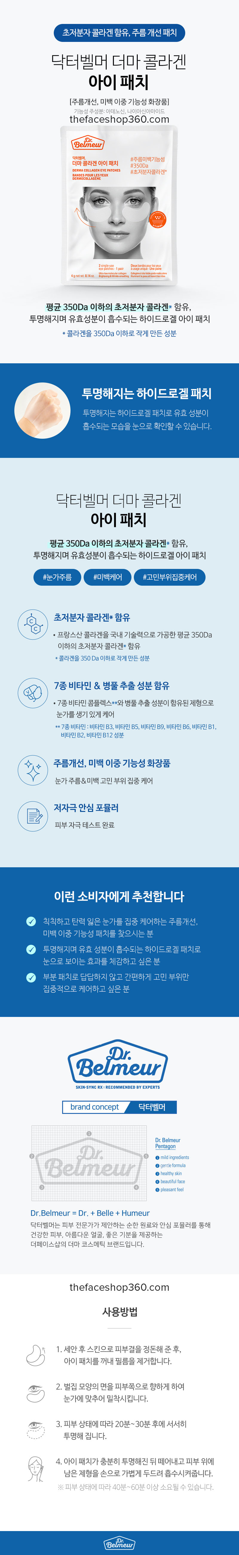 Dr. Belmeur Derma Collagen Eye Patches là Mặt nạ đắp vùng mắt dạng Hydrogel được nghiên cứu sản xuất bởi chuyên gia và bác sĩ da liễu Hàn Quốc. Chuyên trị nếp nhăn, quầng thâm, bọng mắt, chống chảy xệ cơ/da. Sản phẩm thuộc dòng dược mỹ phẩm Dr. Belmeur của The Face Shop. Bao gồm 2 miếng trong 1 túi.