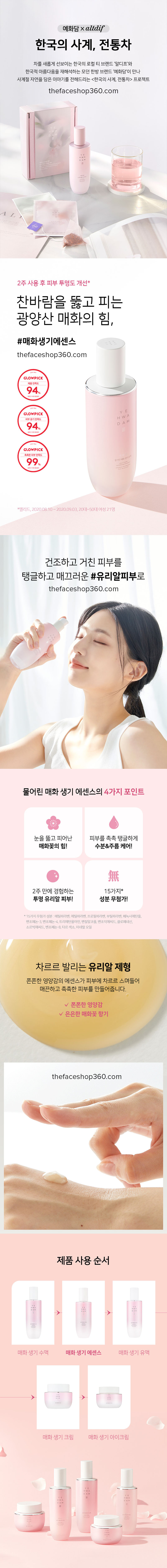 Truyền thuyết dân gian xứ Kim Chi kể lại rằng, người phụ nữ xứ sở này từ ngàn xưa luôn mang vẻ đẹp “làn da sáng như sao trời, mịn màng tựa ngọc trai”. Đó là nguồn cảm hứng cho The Face Shop nghiên cứu và phát triển dòng sản phẩm từ thảo dược truyền thống YEHWADAM. Dòng sản phẩm được chiết xuất từ nguyên liệu quý hoàn toàn từ thiên nhiên. Mang đến cho bạn làn da căng bóng mịn, săn chắc, đàn hồi tốt, đầy sức sống. Đánh thức ánh sáng hồng hào tự nhiên của làn da. Phù hợp với mọi loại da từ 20 tuổi trở lên.