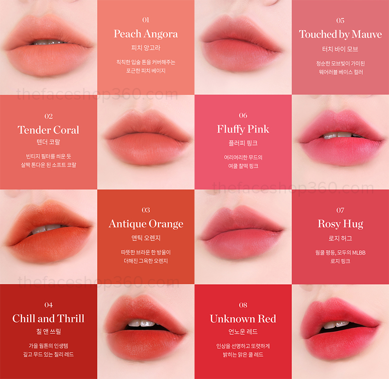 Bảng màu Son Kem Lì Lip Blurrism Long-Lasting Matte fmgt The Face Shop