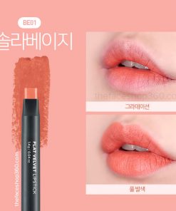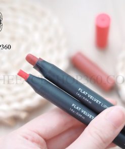 Son môi Flat dòng Velvet chuẩn lì, lâu trôi. Với thiết kế dạng bút dễ cầm, lõi son hình vuông, đầu cây son phẳng giúp dễ dàng tạo đường viền môi và dàn trải son trên môi thuận tiện. Màu sắc tươi trẻ, độ lên màu của son chuẩn mà không phải thoa nhiều lớp.