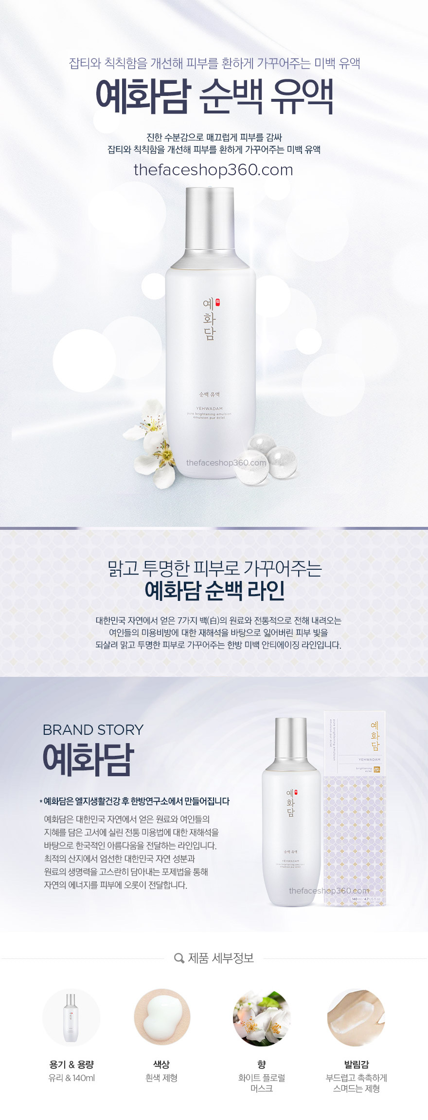 Yehwadam Pure Brightening là một dòng sản phẩm làm trắng sáng / làm trắng chống lão hóa. Tái tạo làn da, da trắng hồng rạng rỡ. Da của chúng ta sẽ trắng dần lên, các khuyết điểm tối màu (nám/tàn nhang/thâm) cũng mờ dần đi. Nếu bạn muốn trắng da nhẹ nhàng, chống lão hóa, thì đây là sản phẩm mà các chuyên gia khuyên dùng.